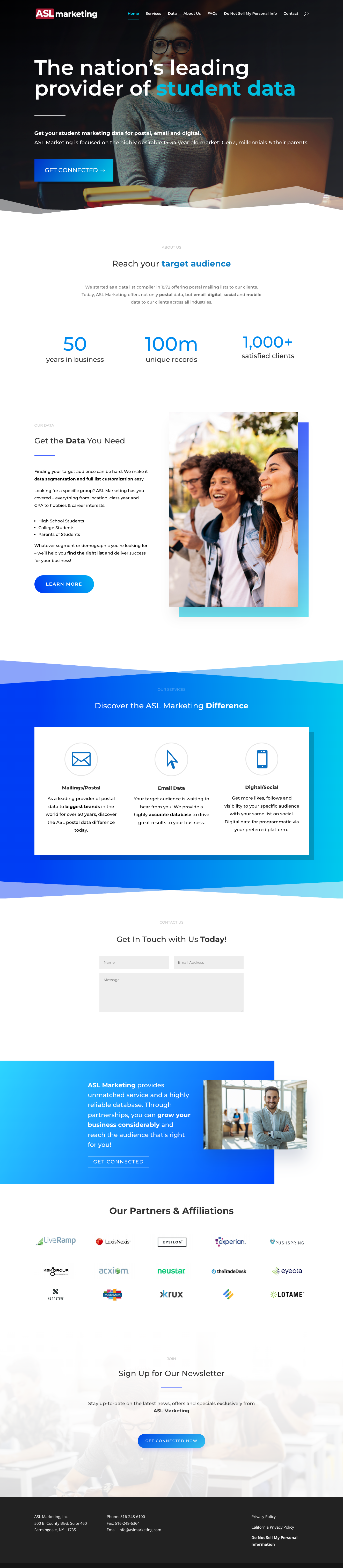 For over 40 years, ASL Marketing has been the nation’s premier provider of student marketing data, focused on the highly desirable 13-34 year old market. We started as a data list compiler back in 1972, offering postal mailing lists to our clients. Today, ASL Marketing continues to offer postal data as well as email, digital, social and mobile data to our clients across all industries. The direct marketing landscape has dramatically changed over the last 40 years and we’ve kept abreast of those changes to deliver the best-most responsive student marketing data.