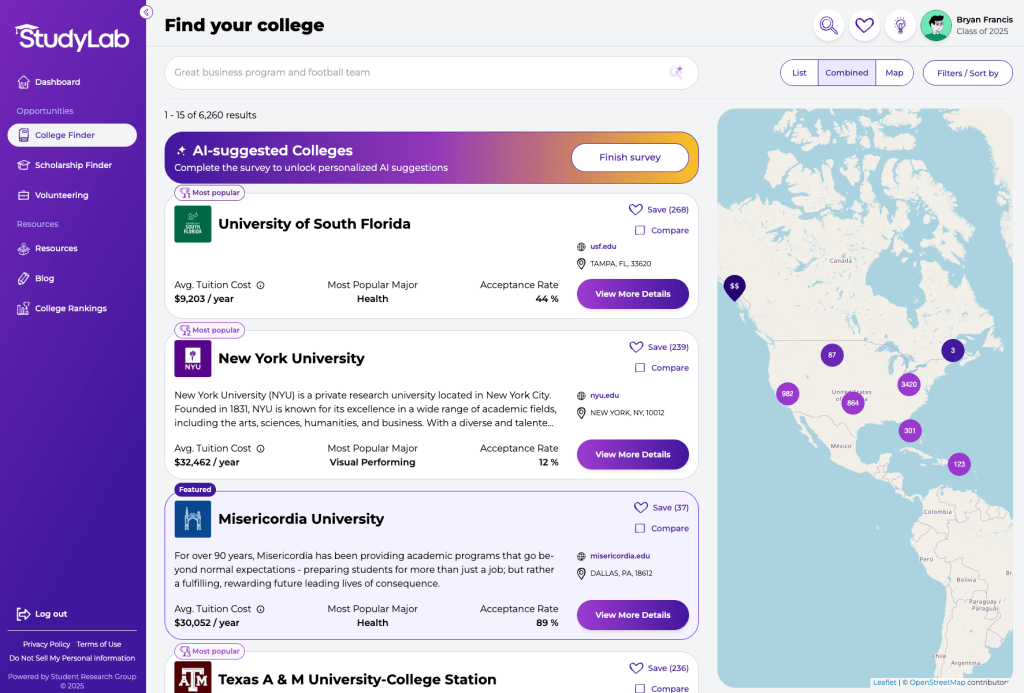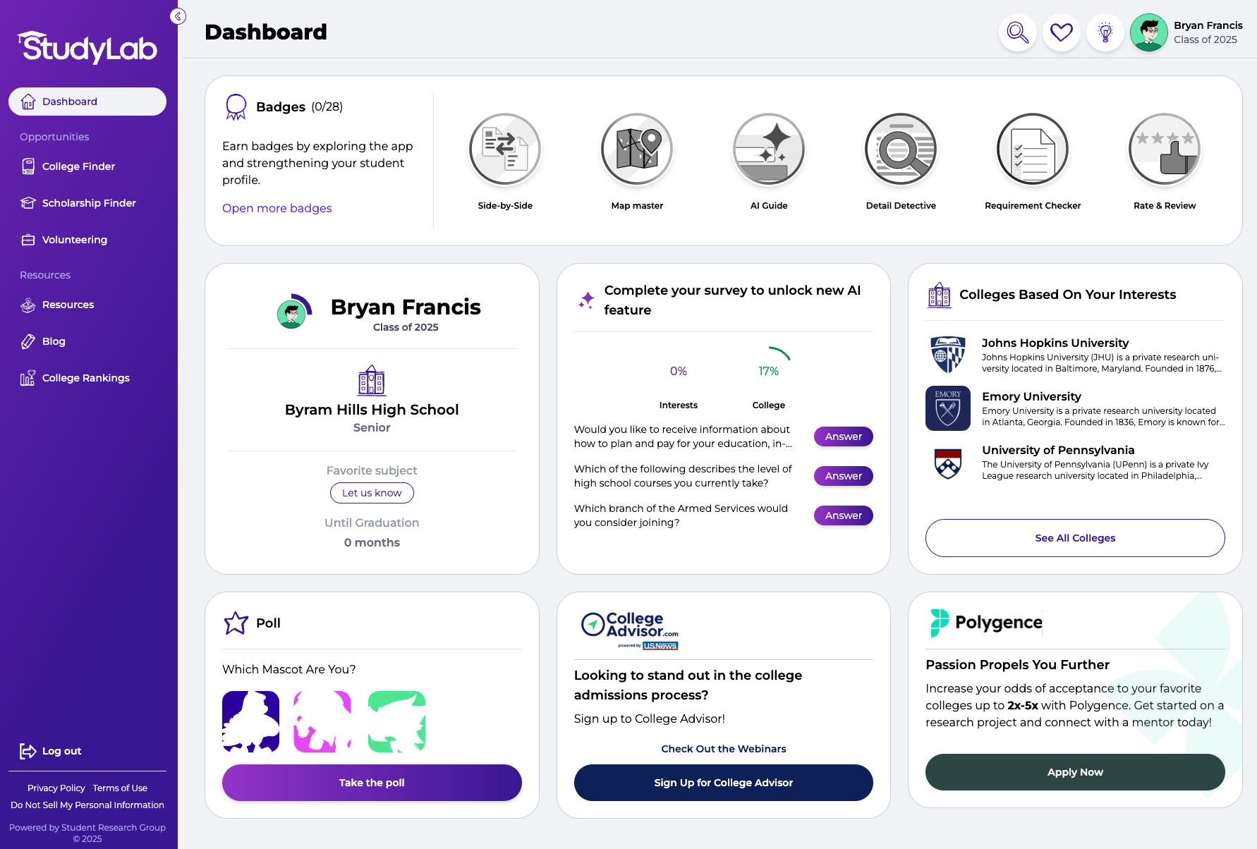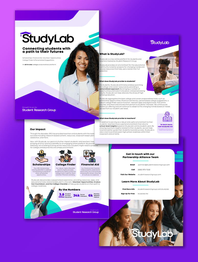 StudyLab is a platform designed to give students access to great college prep resources like College Finder, Scholarship Finder, Volunteering, along with resources, free textbook access and more.
